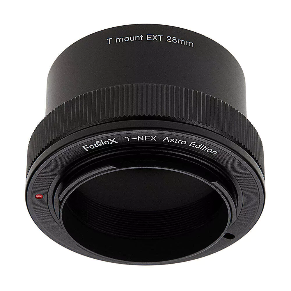Astro Edition-Adapter wurden speziell für Astrofotografen entwickelt und enthalten ein Verlängerungsrohr zum Fokussieren bei einigen Teleskopen, bei denen es Probleme geben könnte, den Fokus weit genug entfernt einzustellen. Das Verlängerungsrohr ist abnehmbar und gibt einen Standard-T-Mount-Adapter für Teleskope frei, die nahe genug am Spiegel fokussieren oder eine Barlowlinse installiert haben, oder wenn Sie T-Mount-Objektive und Zubehör auch tagsüber verwenden möchten.