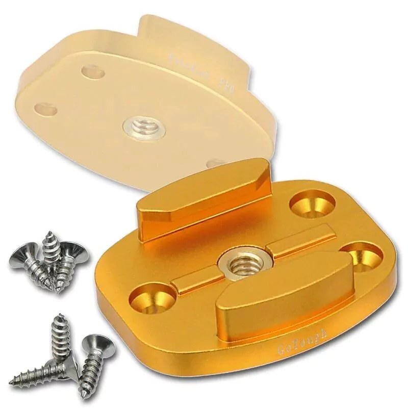 GoTough stellt die Quick Release (QR)-Halterung mit Schraubenlöchern vor. Diese Ganzmetallhalterung ist mit dem Schnellverschlusssystem von GoPro kompatibel. Befestigen Sie Ihre GoPro-Kamera einfach an der GoTough QR-Stativhalterung und Sie können Ihre Kamera schnell an nahezu jeder Oberfläche befestigen, indem Sie die Basis über die drei Schraubenlöcher montieren oder die Basis an jeder 1/4-20-Zoll-Standardstativhalterung montieren.