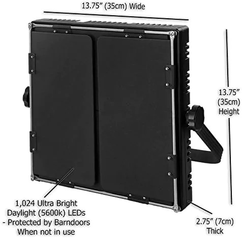 Name Fotodiox Pro LED-1024ASL Farbabgleich Wolfram zu Tageslicht ~ 3200k-5600k ± 200 Anzahl der Lampen 1024x 0,06w LED-Lampen Lichtausbeute 3200k – 2300 lx 5600k – 2700 lx EV100 @ 1m1 3200k – 9. 3 ΔEV 5600k – 9.5 ΔEV LED Abstrahlwinkel 60 Grad – Modifizierbar mit Barn Doors Stromversorgung XLR 4-pin Stromversorgung 110-240v Einheit Dimmer Control Dial 10-100% Dimmbar Kit Gewicht ~ 15 lbs. Herstellung Fotodiox Inc.