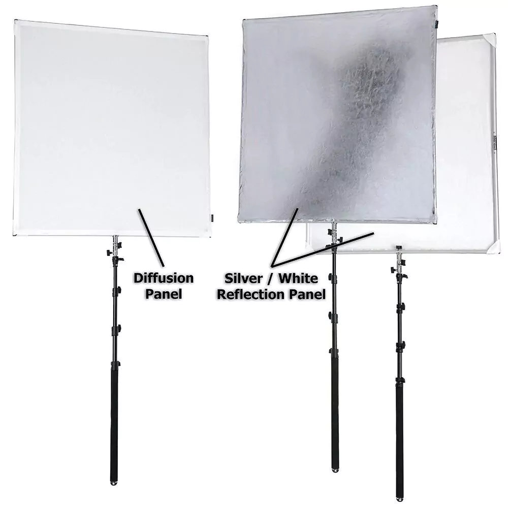 Das komplette Kit umfasst den zusammenklappbaren Rahmen mit integrierten Montagehalterungen, eine 2-Stopp-Diffusionsplatte, eine silber/weiße Reflektorplatte und einen ausziehbaren Auslegergriff. Außerdem passt alles perfekt in die mitgelieferte weiche Tragetasche.