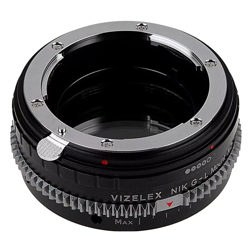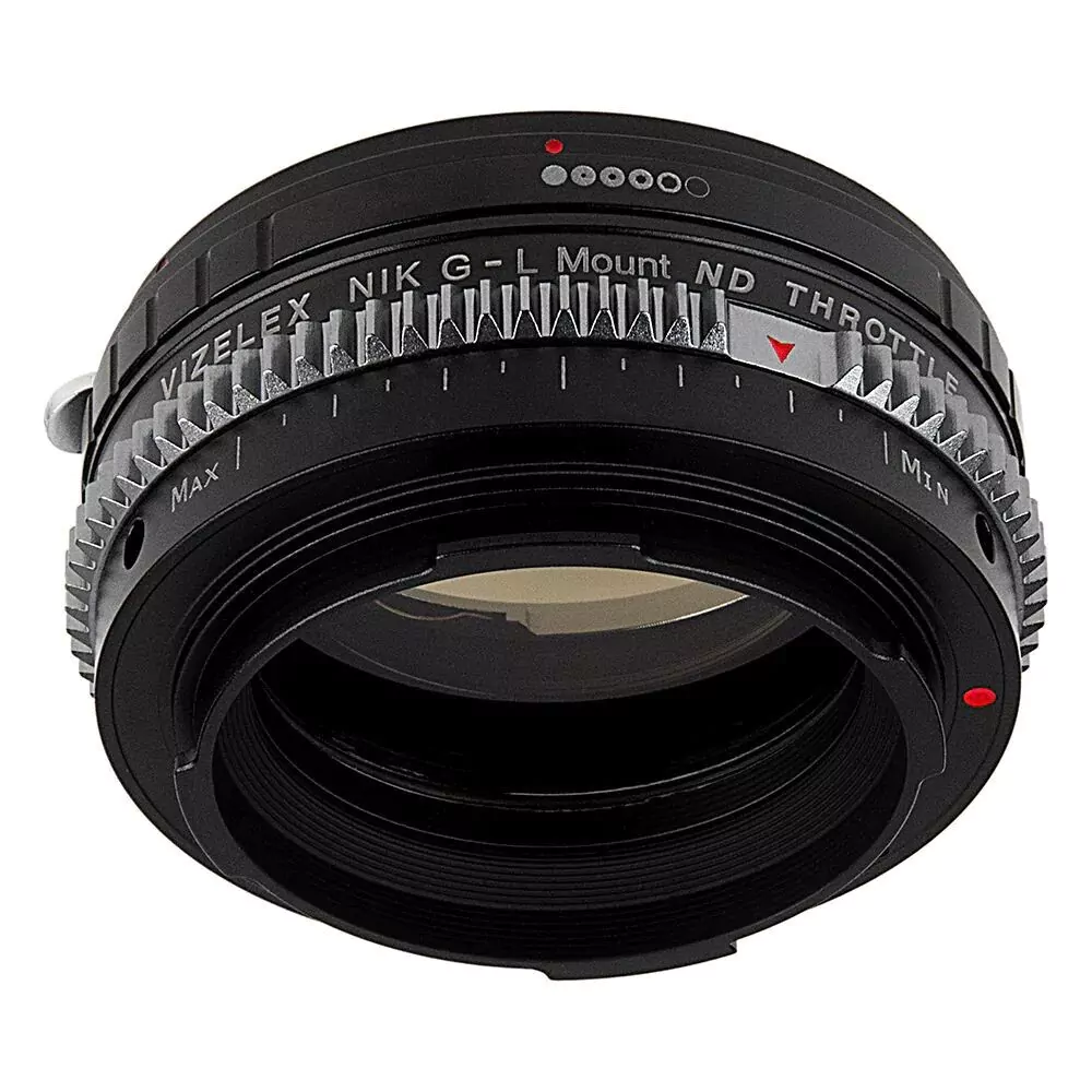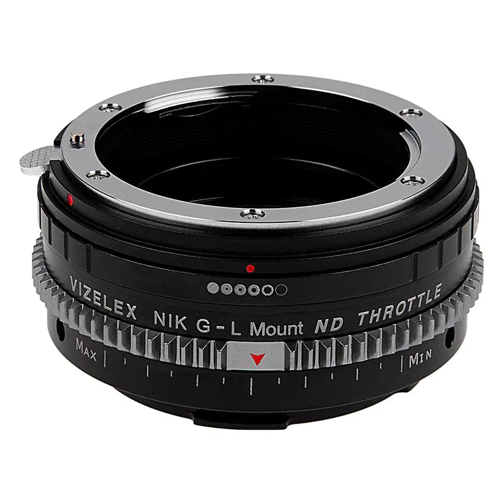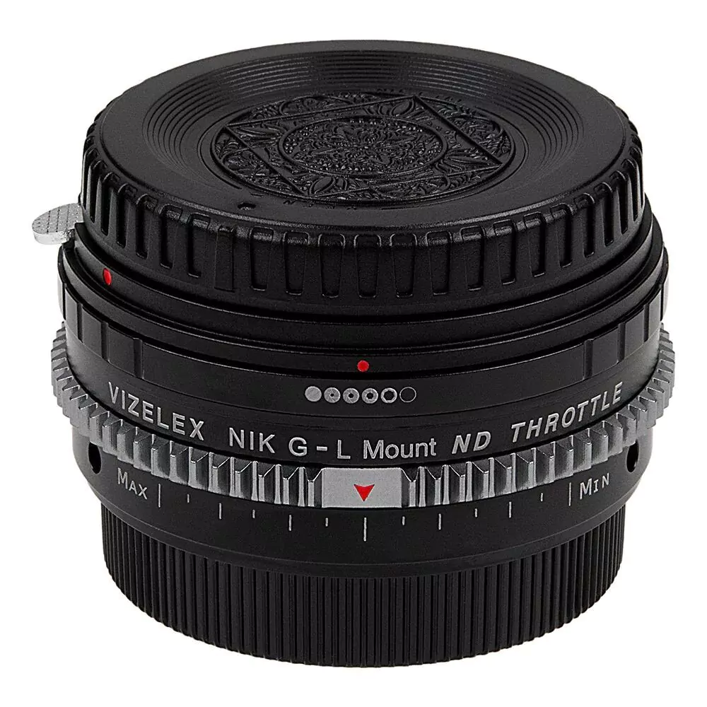 Fotodiox Vizelex ND Throttle Lens Adapter Nikon F Mount G-Type D/SLR Objektiv für ausgewählte spiegellose L-Mount Alliance-Kameras mit integriertem variablem ND-Filter (2 bis 8 Stopps)